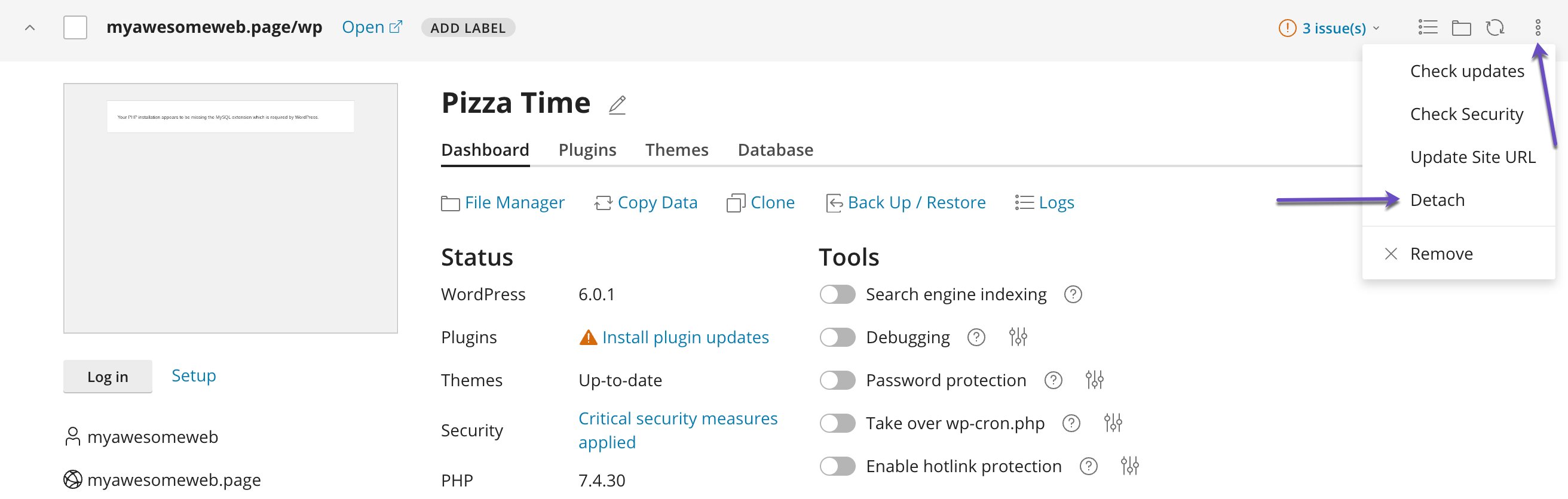 - From the WordPress Toolkit main page, in a site list entry, click the three dots icon, and then click Detach: