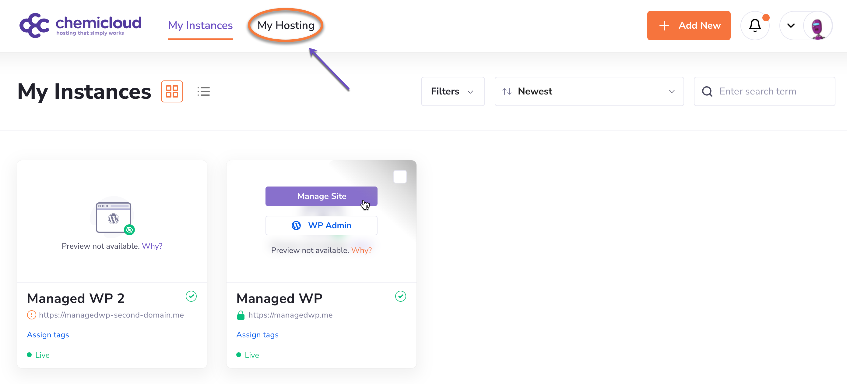 - Log in to your WordPress Manager and select My Instances in the top header.