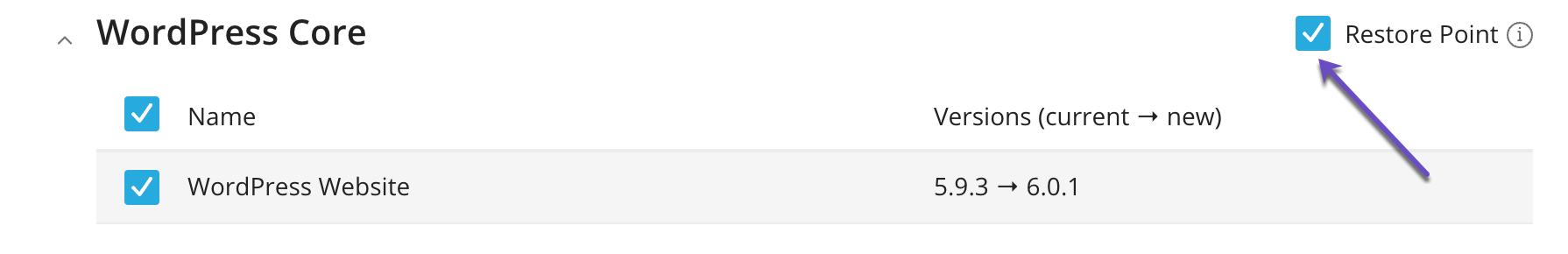 Alternatively, you can use the Smart Update feature. Smart Update enables you to test an update without actually affecting the site. Smart Update does this by creating a complete clone of the website, running several preliminary checks, updating the cloned website, and rerunning the checks to see if the update breaks anything. The results include before-and-after screenshots that you can compare to make an informed decision about whether or not to proceed with the update on your site in production.To enable Smart Update, click the Smart Update toggle button.