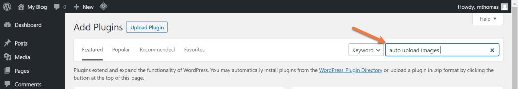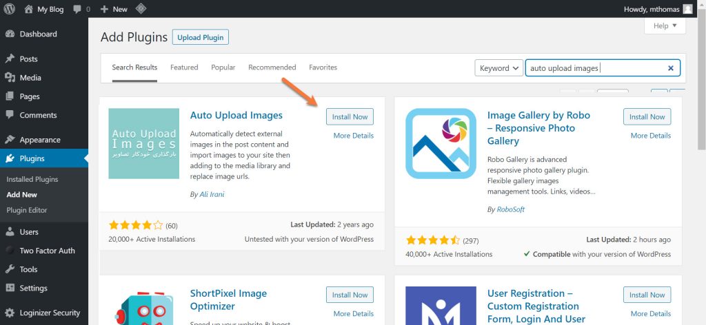 Step 2: Locate Auto Upload Images in the search results and click Install Now.