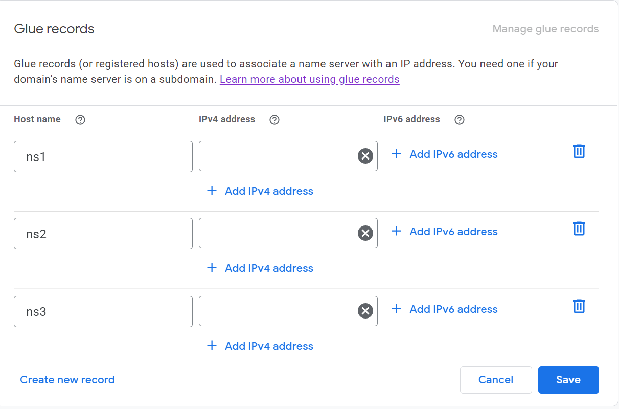 On the Glue records page, click the Add IPv4 address button for each name server. Your screen should look like the one below: