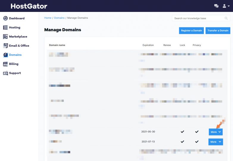 Step 3: You will see a list of domains registered with HostGator. Click the More button for the domain you wish to set up custom nameservers to expand the domain tools: