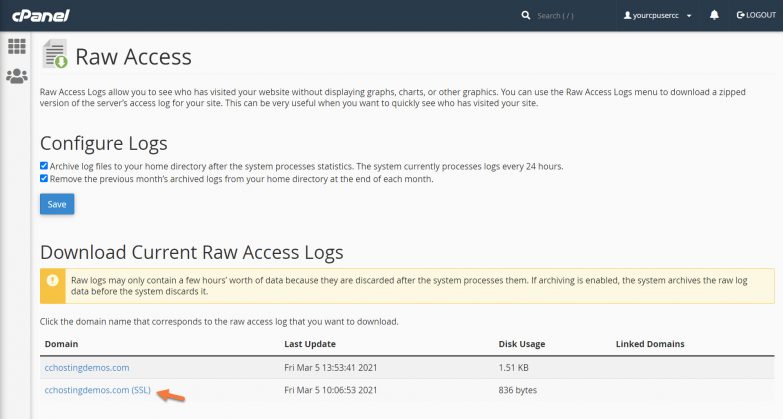 Step 3: When the Raw Access panel has opened, click the domain for which you want to download raw access logs.