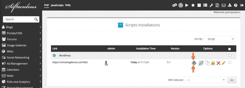 You will see a list of your WordPress installations. Click on the WP Manager icon on the row adjacent to the WordPress site you need to access.