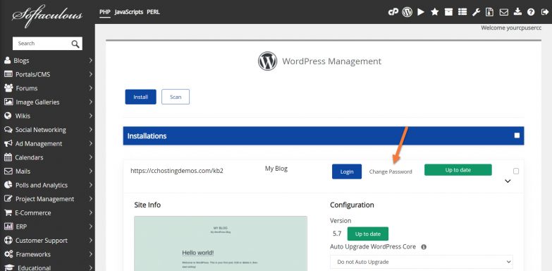Step 4: The Softaculous WordPress Management Tool will open. Click Change Password.