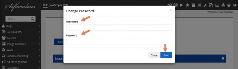 The Change Password modal will open. Enter the username assigned to the account for which you wish to change the password. Then enter your new password. Click Save to change the account’s password.