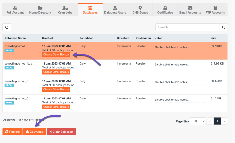 Step 4: After clicking Databases, you will be given a list of available database backups. In my example, I’m going to download a database called “cchostingdemos_8” from the latest backup, so I will choose the backup at the top by clicking on it. If you’re using WordPress, here’s a helpful guide on how to find the name of your WordPress database.