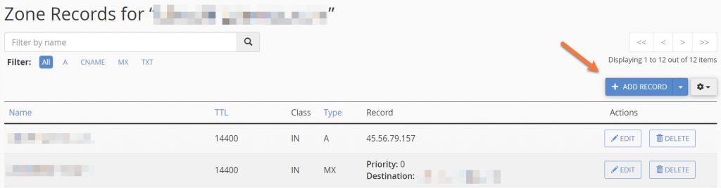 Adding these records is very easy. To do this, return to the zone editor and click the blue Add record button.
