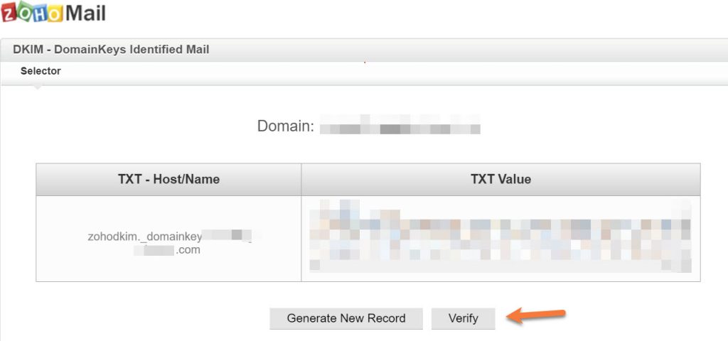 Click the blue Add Record button to add the DKIM record and return to the Zoho Mail Setup screen. Click Verify beneath the DKIM record to verify the DKIM record has been properly configured.