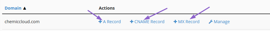4) From this area, you can either create a new A Record, CNAME Record or add an MX record.