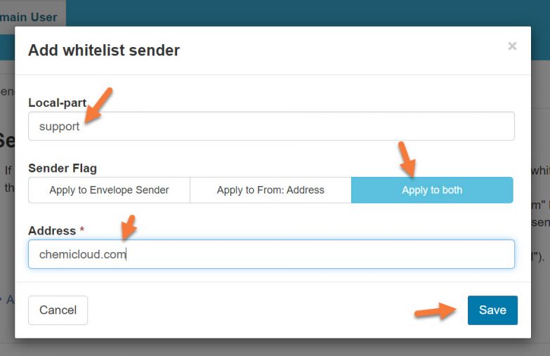 This configuration will whitelist all the emails coming from any @chemicloud.com e-mail address sent to [email protected] using both the Envelope Sender and From: address, giving the best chance for the rule to catch the messages.