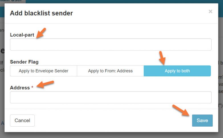 Step 3: Click the link + Add blacklist sender to open the Add Sender to Blacklist modal.