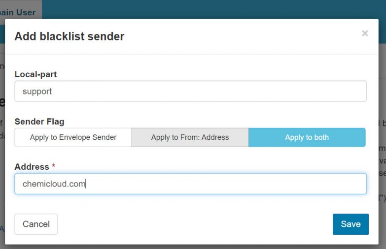 This configuration will blacklist all the emails sent to [email protected] from any email account created under chemicloud.com using both the Envelope Sender and From: address, giving the best chance for the rule to catch the messages.