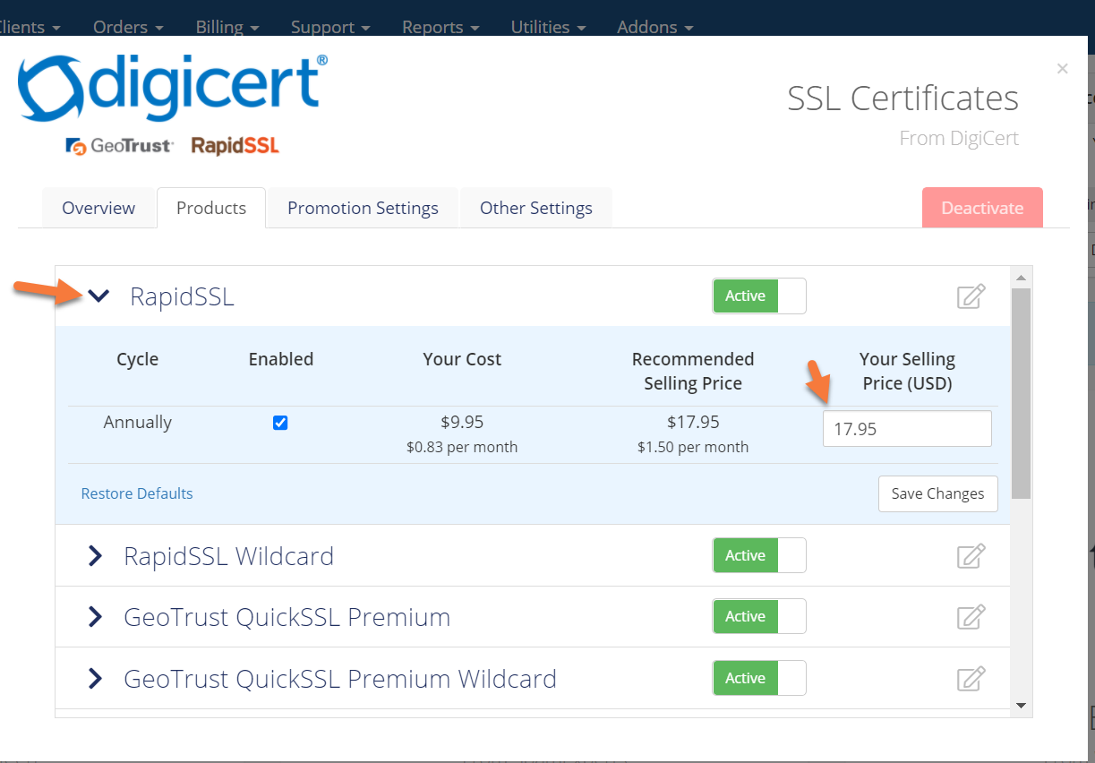 It’s also on this modal window where you can choose to not sell a product from DigiCert, or whichever provider you’ve selected in WHMCS MarketConnect. To opt not to sell a product, simply click the active button to set it from active to inactive.