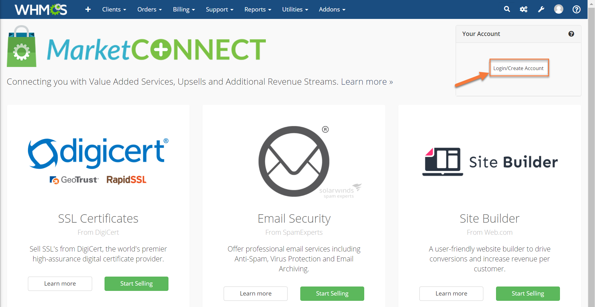 Step 3: Before you can sell any of the services listed on the WHMCS MarketConnect page, you have to create a WHMCS MarketConnect account. To do this, click the Login/Create Account button in the top right corner just above the Site Builder icon.