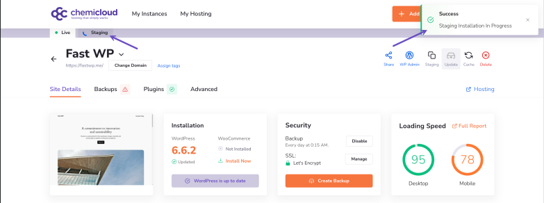 Step 5) Once you click Create Staging, our system will begin creating the staging environment for your website and you’ll be able to see the progress as shown below: